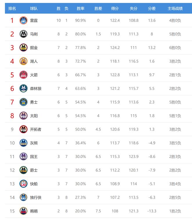北京时间2025年11月11日,今日NBA有9场比赛,湖人、快船、开拓者、马刺、独行侠、森林狼、太阳、爵士、鹈鹕参与其中,赛后西部排名变成了变化,6队排名发生互换。